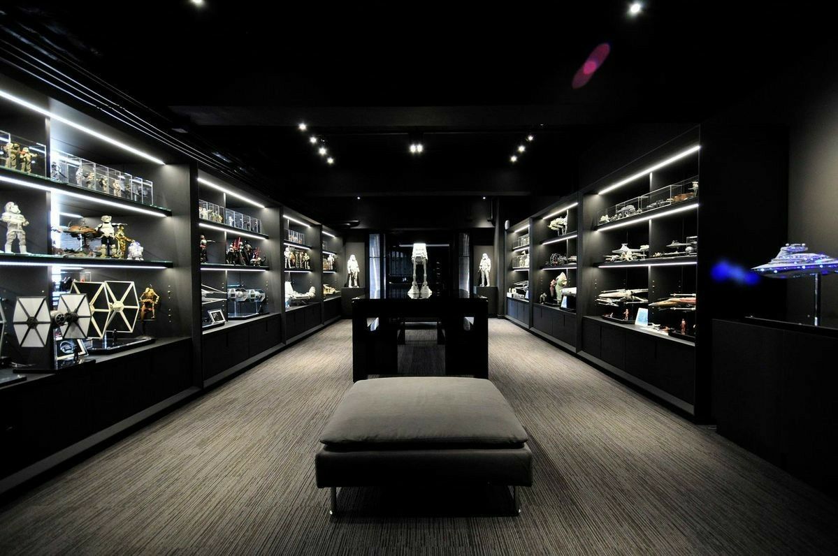 Exhibición de artículos de colección en garaje.